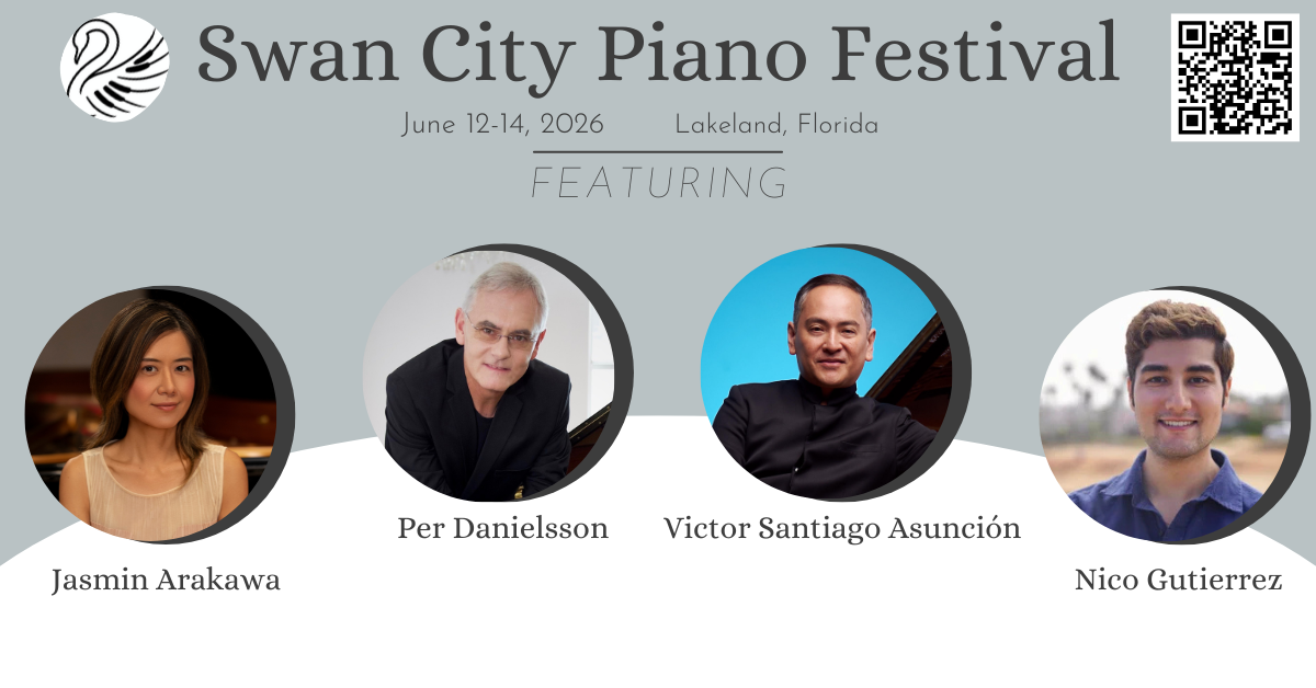 The Swan City Piano Festival aims to engage the vibrant arts culture of Lakeland through a multi-day celebration of pianists and piano repertoire, past and present. The Festival champions aesthetically-diverse pianists from around the country with unique musical and curatorial voices, and commissions composers to write new works that cultivate a living repertoire. World class guest artists connect with community members of all ages through educational programming and immersive performance events.